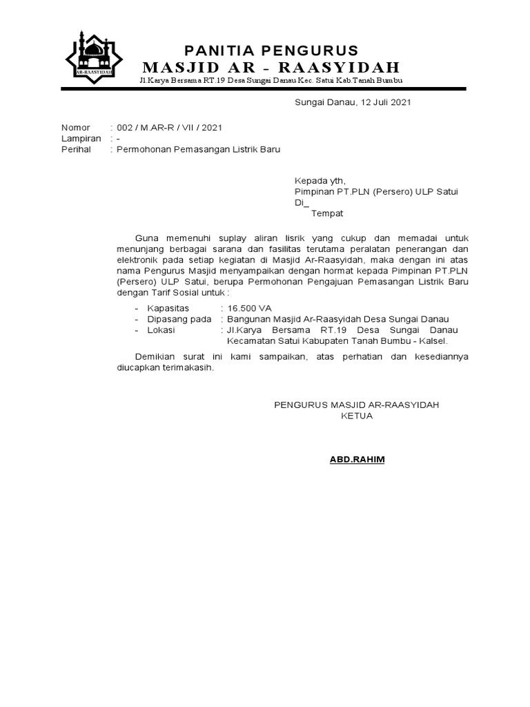 Surat Permohonan Pemasangan Listrik Baru Masjid 2021 Pdf